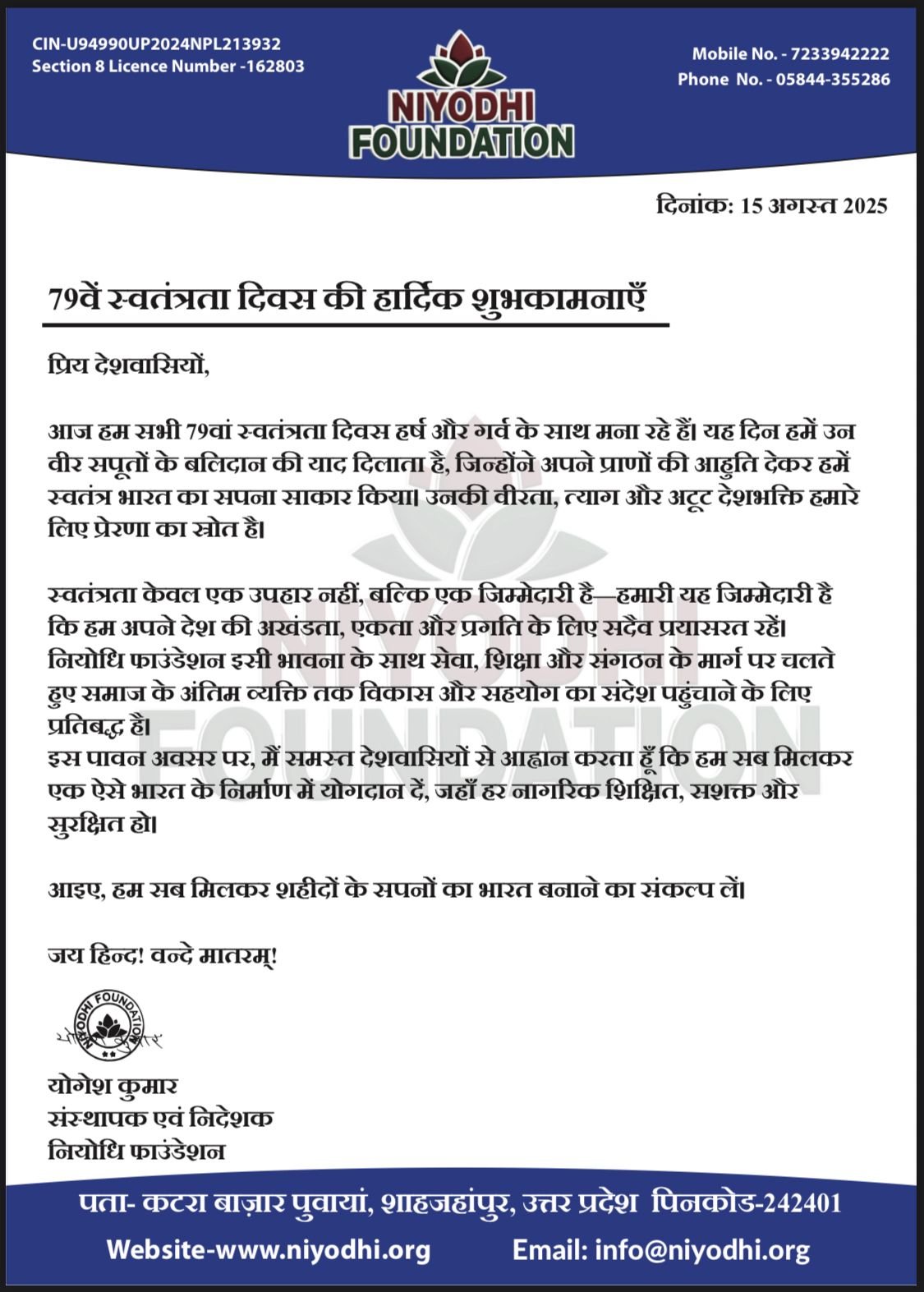 “स्वतंत्रता केवल एक उपहार नहीं, बल्कि एक ज़िम्मेदारी है। हमारी यह जिम्मेदारी है कि हम अपने देश की अखंडता, एकता और प्रगति के लिए सदैव प्रयासरत रहें। नियोधि फाउंडेशन इसी भावना के साथ सेवा, शिक्षा और संगठन के मार्ग पर चलते हुए समाज के अंतिम व्यक्ति तक विकास और सहयोग का संदेश पहुँचाने के लिए प्रतिबद्ध है।”