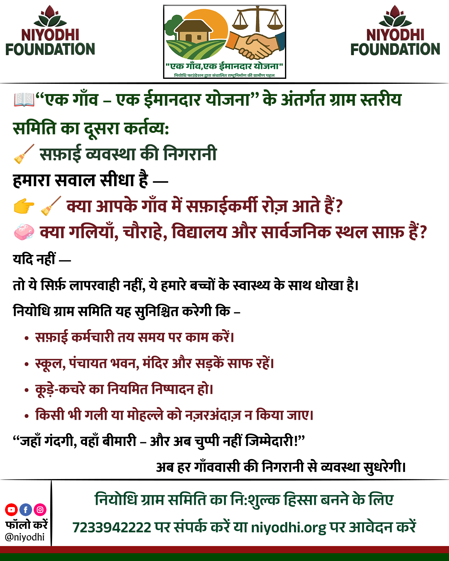 गाँव की सफाई व्यवस्था को मजबूत बनाने और सार्वजनिक स्थलों को स्वच्छ रखने के लिए नियोधि फाउंडेशन ने ‘एक गाँव, एक ईमानदार योजना’ के तहत नई पहल शुरू की है। इसके तहत ग्राम स्तरीय समिति सफाई व्यवस्था की निगरानी करेगी और यह सुनिश्चित करेगी कि सफाईकर्मी रोजाना तय समय पर काम करें।